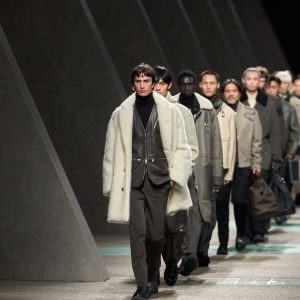 而在細節、布料與剪裁方面,靈感來自薩佛街(Savile Row)。有著劍領及沙漏腰身設計的夾克搭配威爾斯格紋和千鳥格緹花加以重新改造、上色、放大、翻轉。大衣、夾克和長褲上的拉鍊口袋和開口設計是致敬1920年代的女士滑雪服裝。而褲子大腿處的拉鍊設計則讓人聯想到復古飛行服。